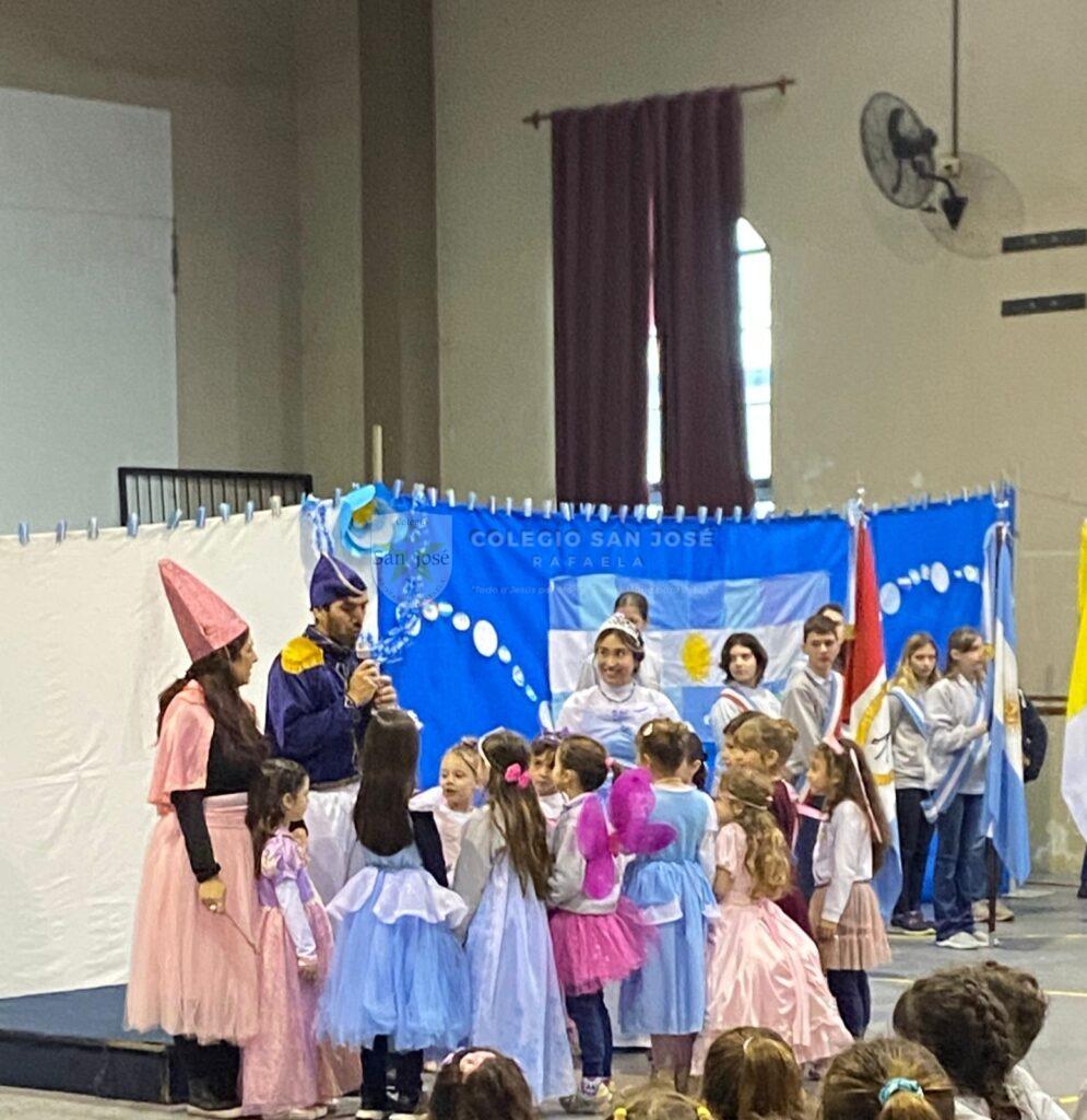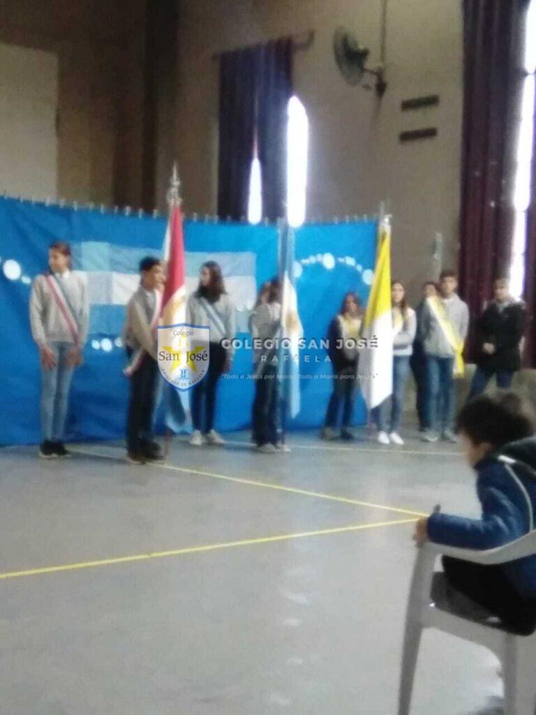 El acto se convirtió en un punto de encuentro entre el pasado y el presente, un puente que conecta a las nuevas generaciones con la gesta libertadora. Posteriormente hicieron su entrada las banderas de ceremonia. La bandera argentina, símbolo de nuestra identidad, fue portada con orgullo por los abanderados y escoltas; a continuación, se izaron las banderas de la provincia de Santa Fe y la bandera papal, en un gesto que reflejó la diversidad y los valores que inspiran a la comunidad educativa. El himno nacional argentino resonó con fuerza en el salón, uniendo a todos los presentes en un canto a la patria.