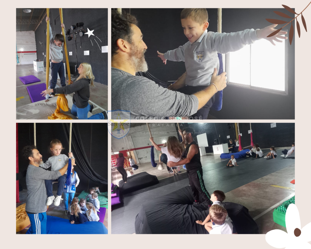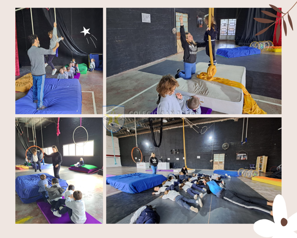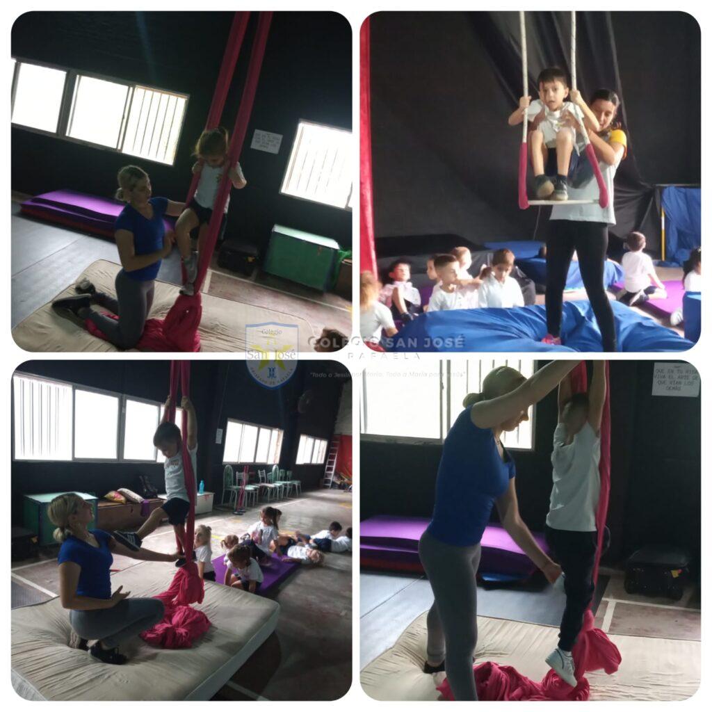 Los niños del turno mañana y la sección «B» del turno tarde comenzaron las clases de circo en «Espacio Disparate». Dónde aprendemos a usar elementos como tela, lira, trapecio, hacemos piruetas y nos divertimos mucho