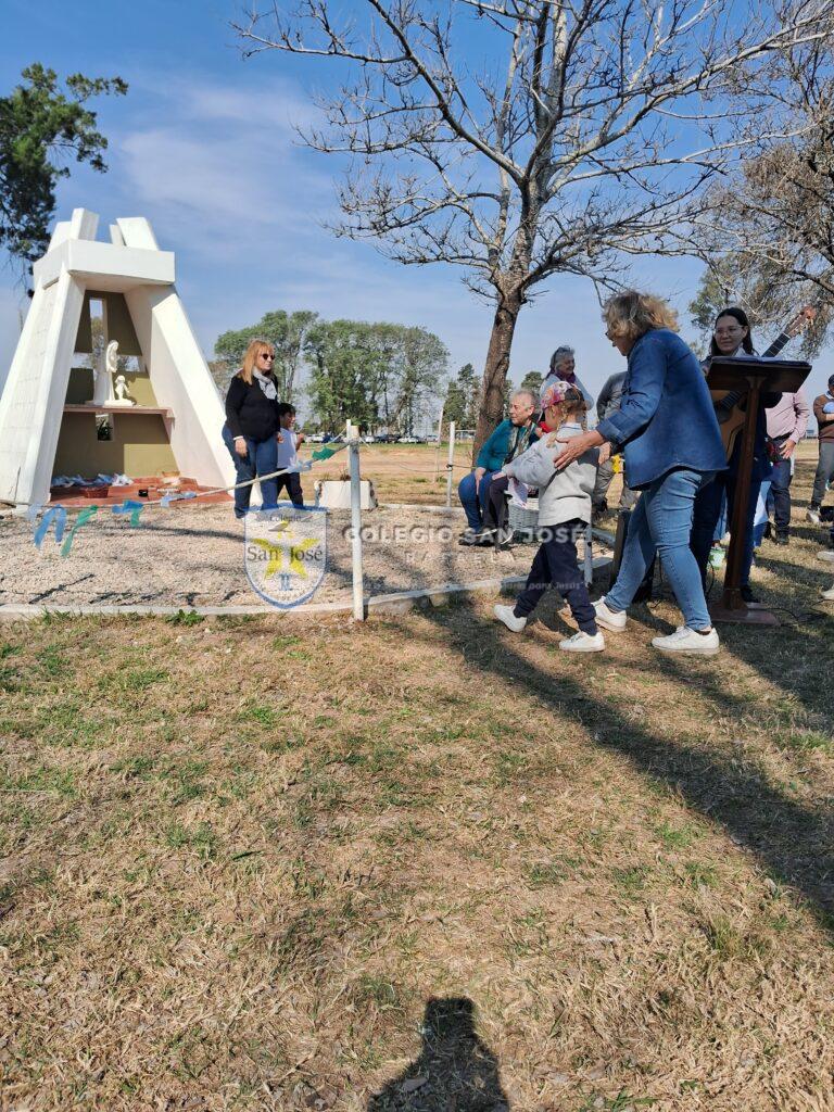 Cada docente realizó un recorrido con 3 estaciones junto a las familias y niños. En la primera estación conversamos sobre quién es María y que sentimos por ella, en la segunda estación descubrimos que María nos escucha con un corazón de Madre por eso confeccionamos tarjetas con intenciones para ofrecerlas en el altar. En la última estación todos los grupos se reunieron en torno al altar, en la ermita del campo.