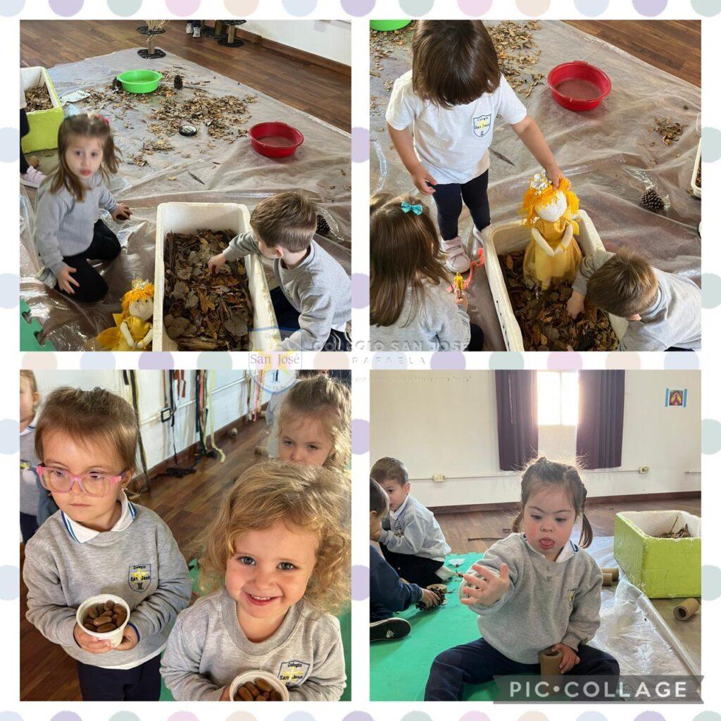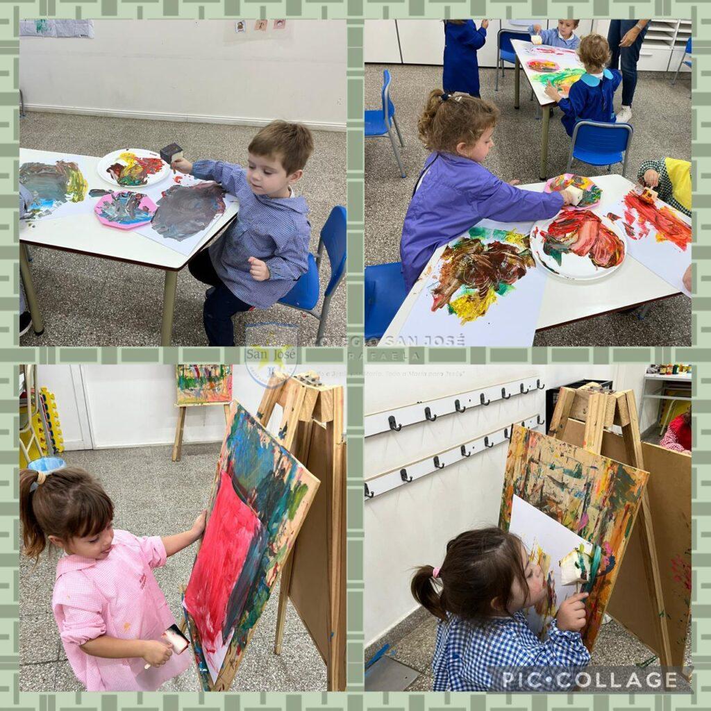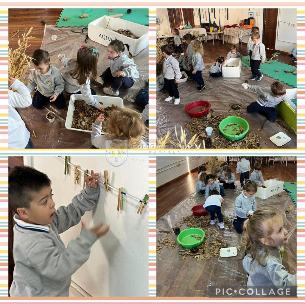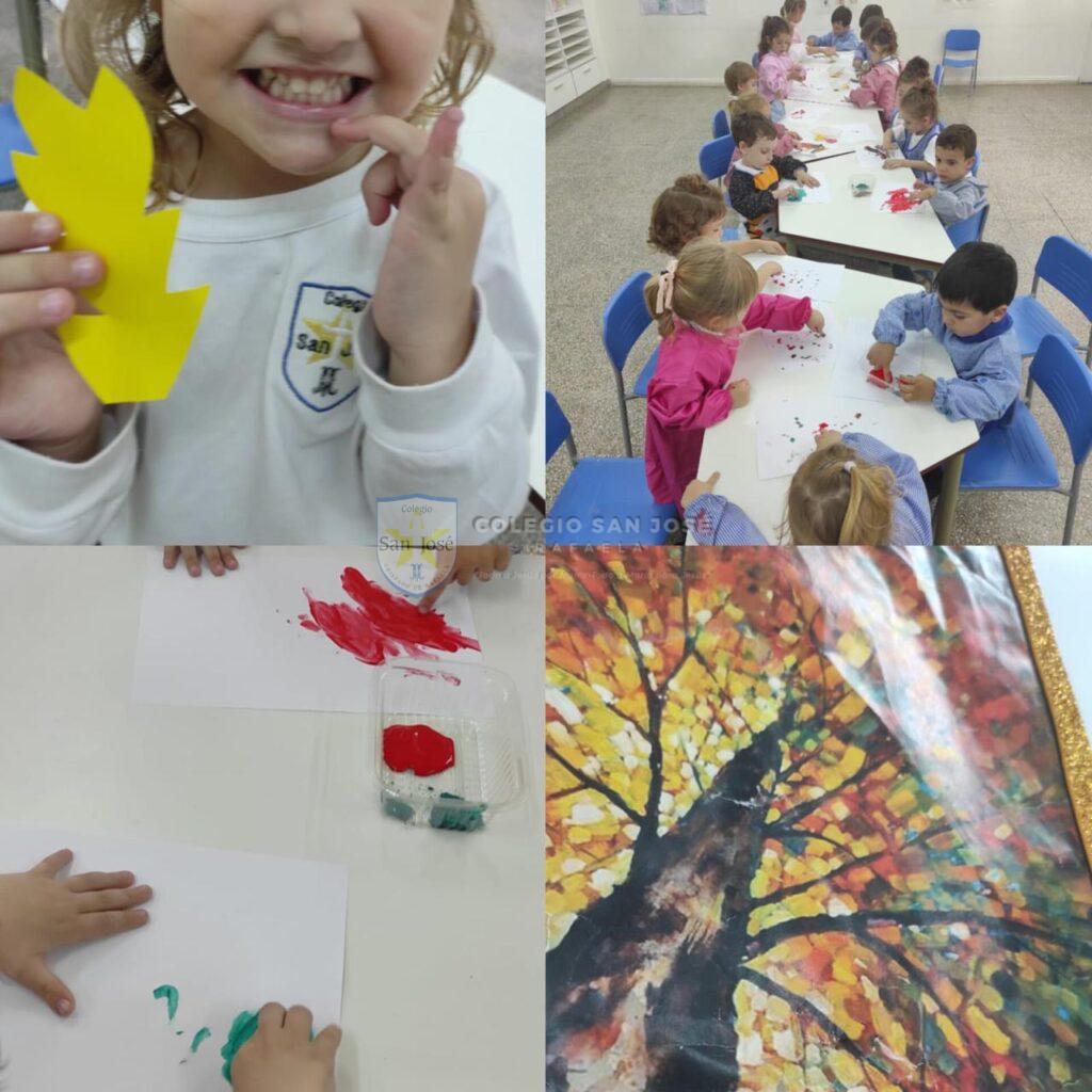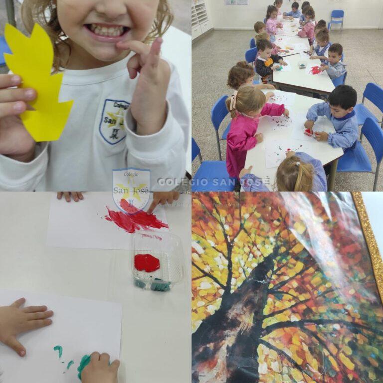 Las salas de 3 años, observaron su entorno y descubrieron los colores del otoño. Con estos colores crearon obras de arte con diferentes materiales.