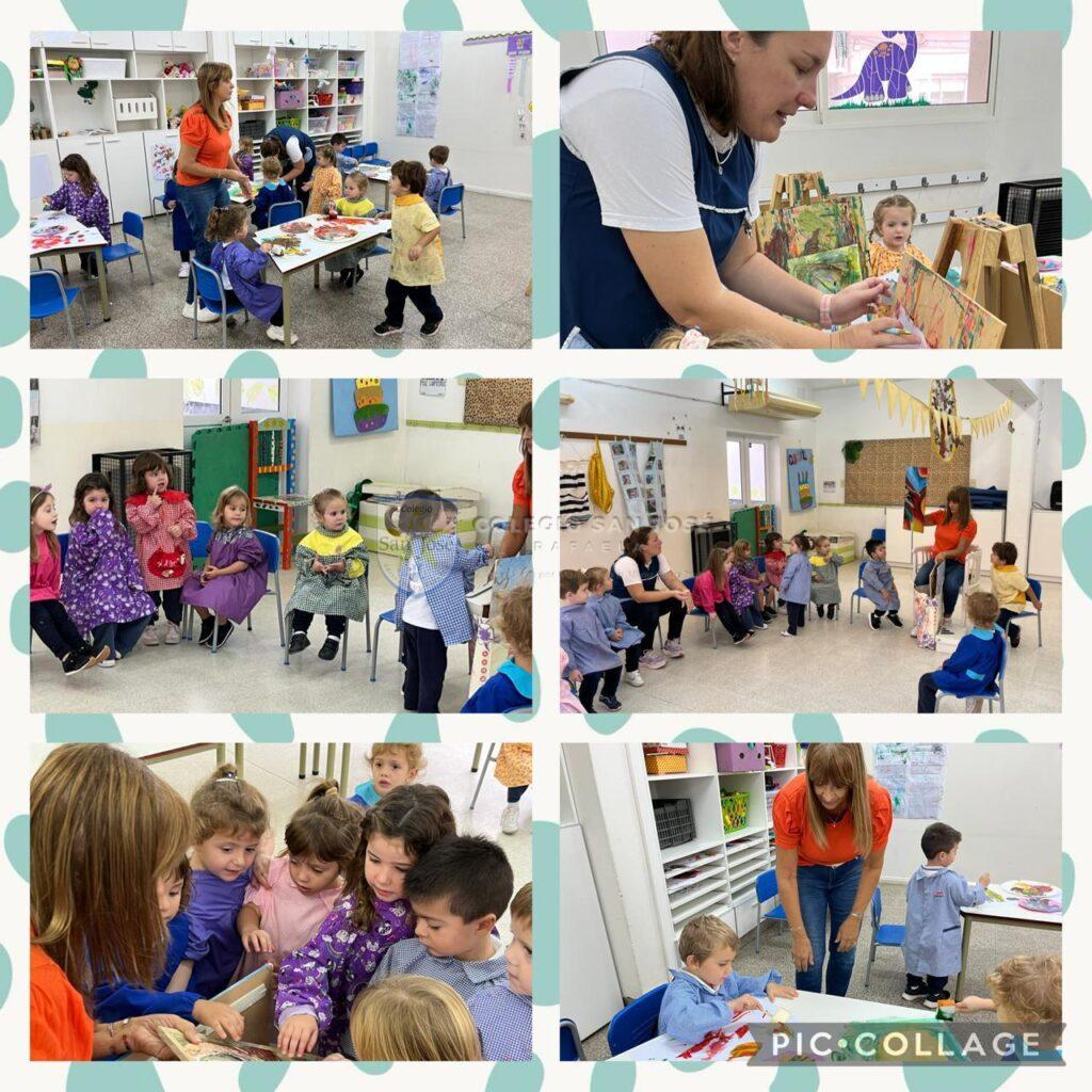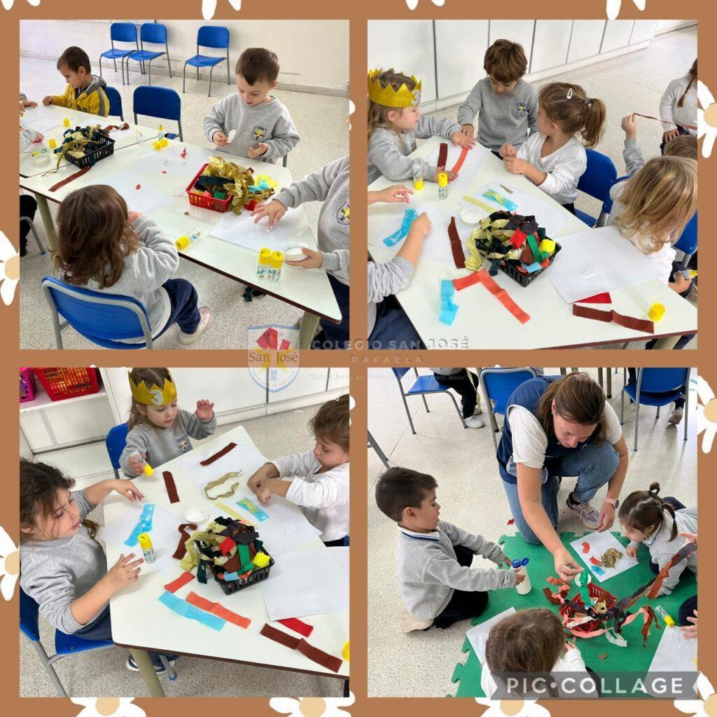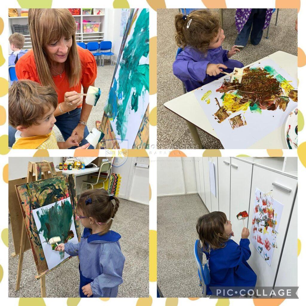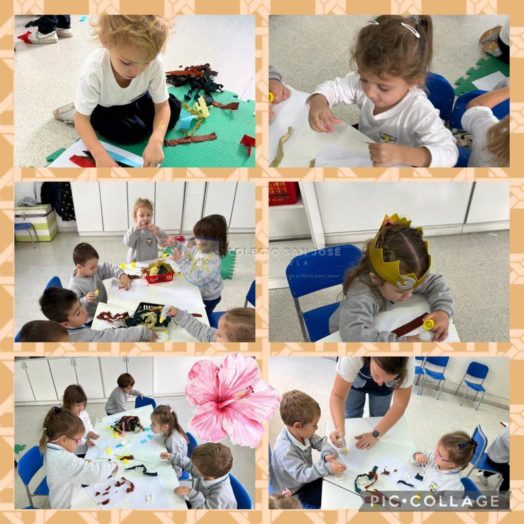 Las salas de 3 años, observaron su entorno y descubrieron los colores del otoño. Con estos colores crearon obras de arte con diferentes materiales.