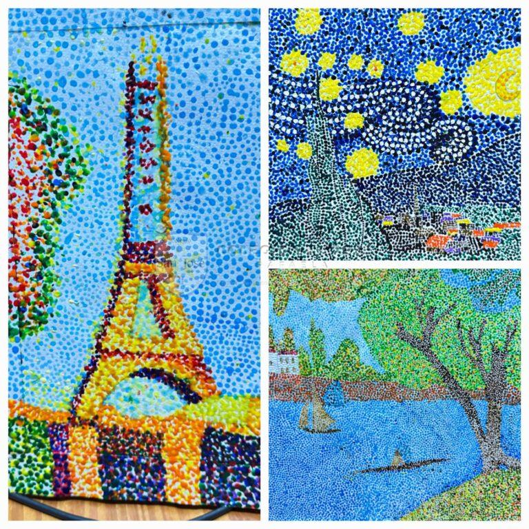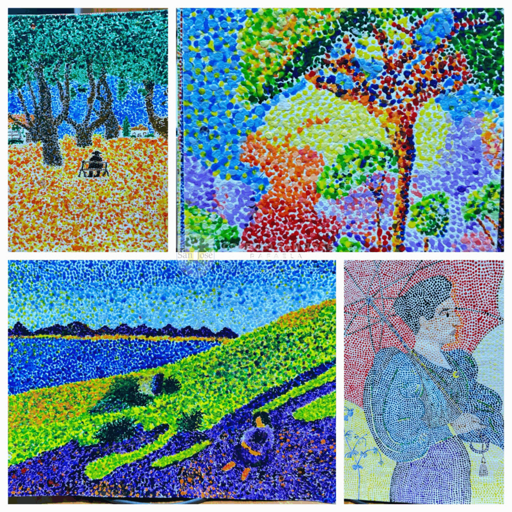 Trabajos de Puntillismo con plasticola de colores :Ernestina Botto; Pierina Llompart, Victoria Fritzler; Clementina Parola; Lucia Anesa Arró; Pilar Coldesina; Irina Elodki.