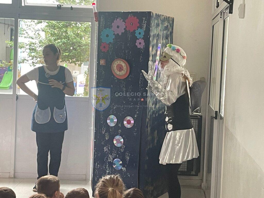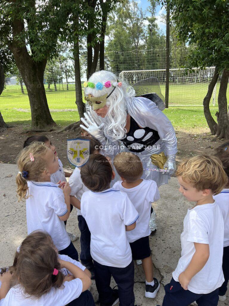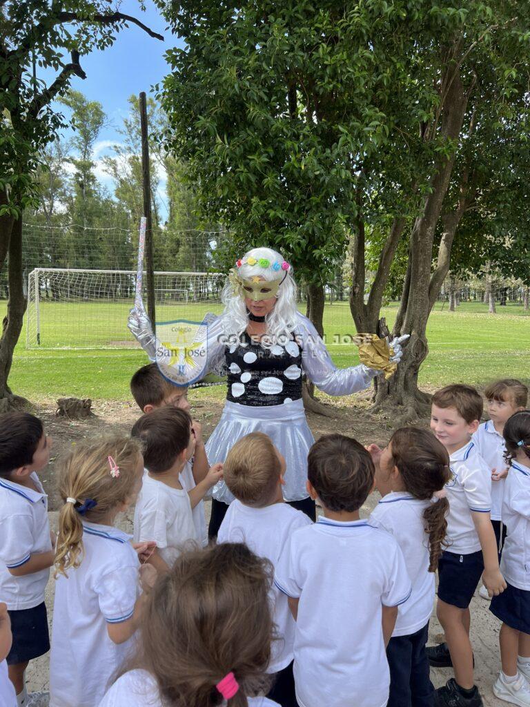 Ella nos contó que viajó en su máquina del tiempo porque quería conocernos. Su amigo Saturnino le contó sobre el hermoso jardín que descubrió el año pasado, sobre los niños, las familias, las seños y profes que viven en el planeta tierra donde pasó momentos inolvidables. Entonces el Hada quiso pasar a saludarnos y traernos un regalo especial ya que se enteró que era el aniversario número 100 del colegio.
