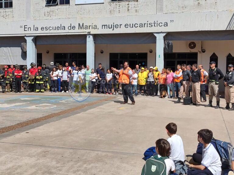 La actividad comenzó a las 9:30 con la salida de alumnas, alumnos y docentes del establecimiento, hacia la plaza 25 de Mayo, y la posterior llegada del personal para atender los distintos factores de la emergencia, como un eventual incendio y problemas de salud del personal.